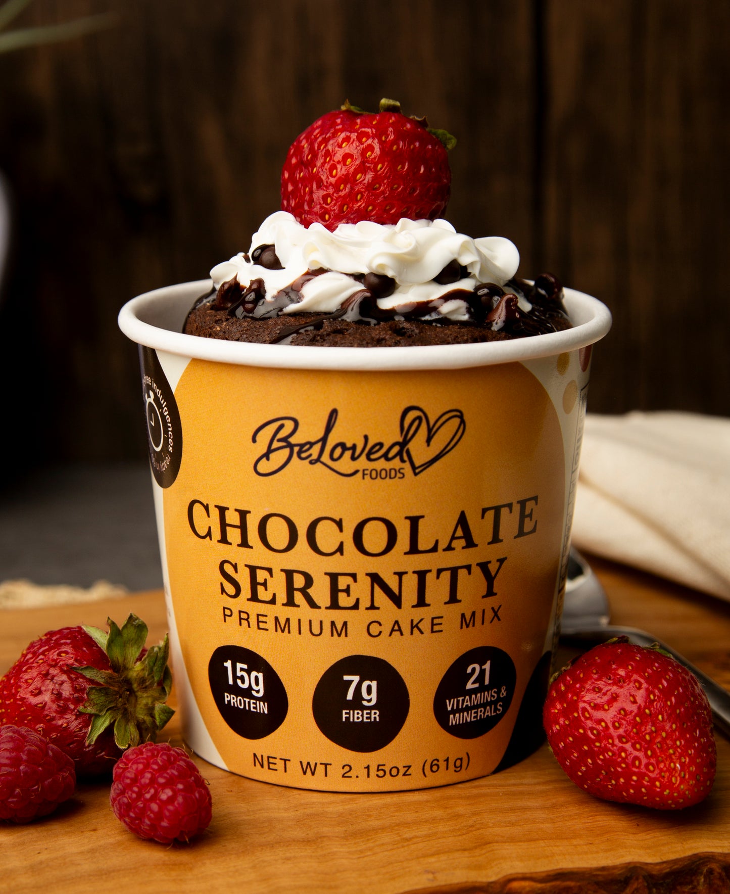 Chocolate Serenity is a decadent, single-serve cake with a rich, deep cocoa flavor, studded with sweet chocolate chips that melt into every bite. With a dense, moist texture and the perfect balance of bittersweet notes and smooth sweetness, it feels like an indulgence—but it’s built to support your goals.